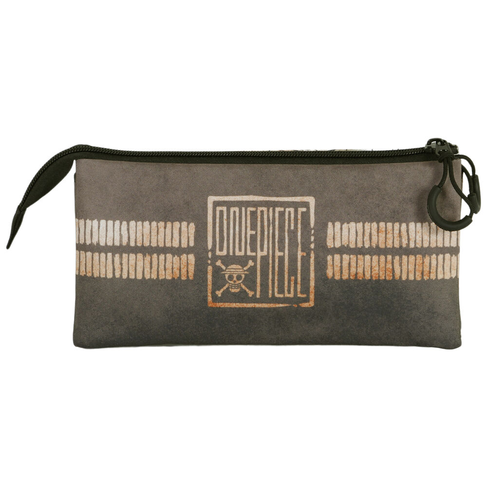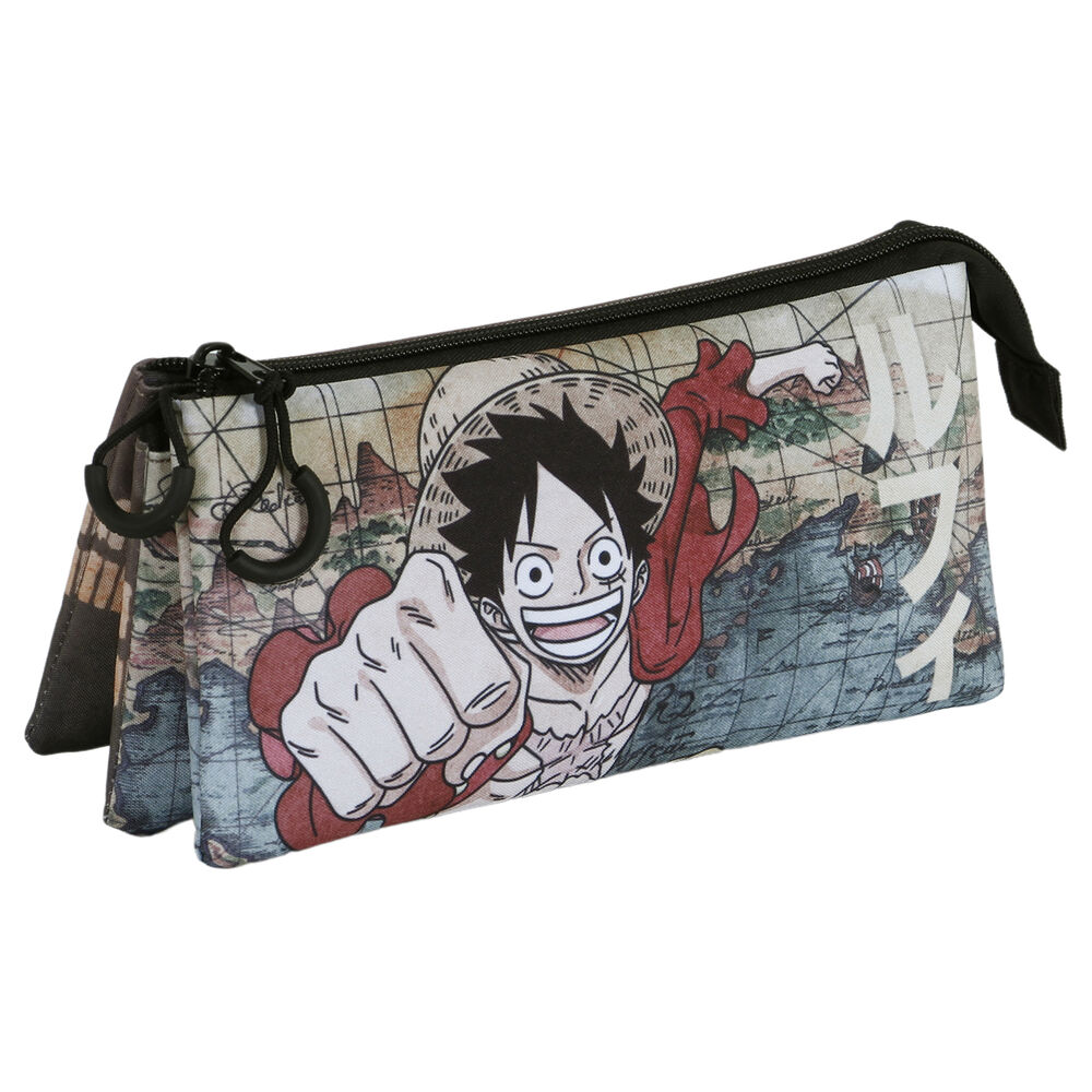 Rechthoekige pennemap met drie vakken voor je spullen. De twee buitenzakken openen met de hoofdrits en de derde met een eigen ritssluiting. Met opdruk van de favoriete held uit de anime en manga One Piece: Monkey D. Luffy.